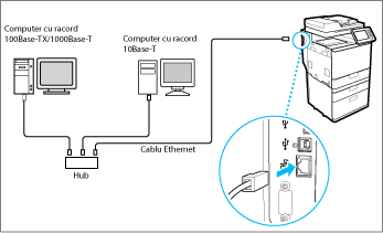 Conectaţi aparatul la un calculator prin intermediul unui router. Utilizaţi un cablu LAN pentru a conecta aparatul la router.