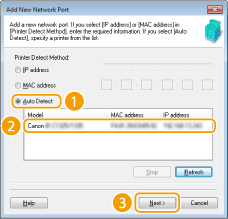 ![]() ![]() Dacă aparatul nu este detectat Faceţi clic pe [Refresh] (Reîmprospătare). Dacă problema nu dispare, clic pe [IP address] (Adresă IP) sau [MAC address] (Adresă MAC) şi introduceţi adresa IP sau MAC a aparatului Vizualizare setări pentru reţea şi apoi clic pe [Next] (Următorul).