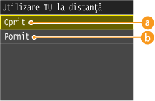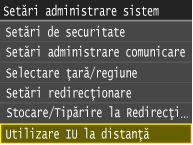 Remote UI (IU la distanţă) este folositoare deoarece aparatul setările aparatului pot fi specificate folosind un browser Web de la calculator. Pentru a folosi Remote UI (IU la distanţă), aparatul trebuie conectat la calculator prin intermediul reţelei. Dacă aparatul este conectat la calculator prin intermediul USB, sau dacă nu aveţi nevoie de Remote UI (IU la distanţă), poate doriţi să dezactivaţi Remote UI (IU la distanţă) pentru a reduce riscul ca aparatul să fie controlat de la distanţă prin intermediul reţelei de programe terţe.