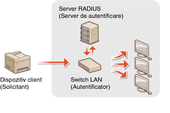 IEEE 802.1X este un standard şi un mecanism pentru blocarea accesului neautorizat la reţea prin gestionarea colectivă a informaţiilor despre autentificarea utilizatorilor. Dacă un dispozitiv încearcă să se conecteze la reţeaua 802.1X, dispozitivul trebuie să treacă prin autentificarea utilizatorului pentru a demonstra că acea conexiune este realizată de un utilizator autorizat. Informaţiile de autentificare sunt trimise către şi verificate de un server RADIUS, care permite sau respinge comunicarea cu reţeaua în funcţie de rezultatele autentificării. Dacă autentificarea eşuează, un switch LAN (sau un punct de acces) blochează accesul din exterior la reţea. Aparatul se poate conecta la o reţea 802.1X ca un dispozitiv client.