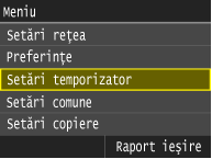 Toate setările pentru temporizator sunt listate cu o scurtă descriere. Setările implicite sunt marcate cu un semn (