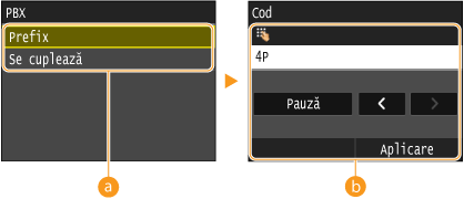 Dacă aparatul dvs. este conectat printr-o PBX (Private Branch Exchange (Centrală telefonică privată)), trebuie setată metoda de acces. Puteţi seta tipul PBX la <Prefix> sau <Se cuplează>. Dacă înregistraţi numărul de acces la linia exterioară la tasta R, puteţi accesa cu uşurinţă linia exterioară.