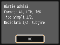 Verificaţi dacă dimensiunea şi tipul de hârtie afişate pe ecran sunt încărcate în aparat şi atingeţi <OK>.