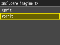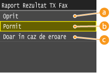 Când selectaţi <Pornit> sau <Doar în caz de eroare> pentru <Raport Rezultat TX Fax>, o parte a unui document fax poate fi inclusă în raport. Setaţi <Includere imagine TX> la <Pornit>.