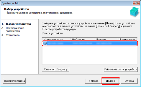 Если устройство не отображается в списке [Список устройств], проверьте состояние соединения между компьютером и устройством, а также настройки IP-адреса и нажмите кнопку [Обновить список устройств]. Если устройство по-прежнему не отображается, нажмите кнопку [Поиск по IP-адресу] → введите IP-адрес устройства → нажмите [ОК]. Способ проверки IP-адреса см. в руководстве по устройству.