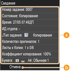 Отображается количество копий, настройки и другие сведения. Для того, чтобы просмотреть подробные сведения, не отменяя задание копирования, нажмите