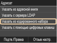 С помощью адресной книги можно задать адресата, выбрав его из списка зарегистрированных адресатов или выполнив поиск по имени в списке адресатов, содержащих имена получателей. Можно также напрямую указать адресата, введя трехзначный номер (кодированный номер набора), назначенный тому ли иному адресату.