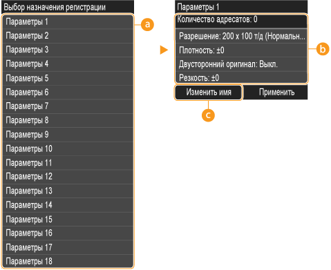 Можно добавить до четырех часто используемых комбинаций настроек факса. Достаточно выбрать необходимую комбинацию настроек, чтобы не настраивать одни и те же параметры перед каждой отправкой факса, например, если вы часто задаете 5 получателей, устанавливаете 2-сторонний исходник и увеличиваете резкость при отправке факса. Можно установить комбинацию настроек в качестве <Параметры 1> для <Параметры 18>.
