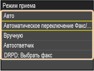 Устройство можно настроить на автоматический прием получения факсимильных сообщений при поступлении входящего звонка, длительность сигналов которого задана временным диапазоном. Переключен. на автоматич. прием