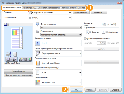 Параметры по умолчанию — это параметры, которые отображаются при первом открытии экрана драйвера принтера. Эти параметры могут быть изменены. Например, при необходимости печатать все документы, включая цветные, в черно-белом режиме можно изменить цветной режим, установленный по умолчанию, на режим [Черно-белый]. Изменив параметры по умолчанию, при открытии окна драйвера принтера значение этого параметра всегда будет [Черно-белый], что исключает необходимость задавать каждый раз одни и те же настройки при печати.