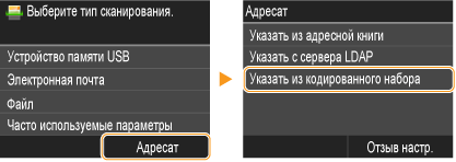 С помощью адресной книги можно задать адресата, выбрав его из списка зарегистрированных адресатов или выполнив поиск по имени в списке адресатов, содержащих имена получателей. Можно также напрямую указать адресата, введя трехзначный номер (кодированный номер набора), назначенный тому ли иному адресату.