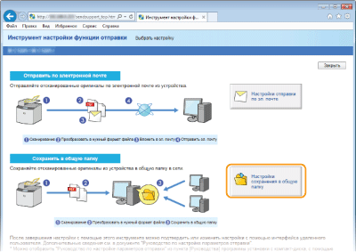 Также можно использовать Удаленный ИП, чтобы указать расположение общей папки путем ее регистрации в адресной книге. Инструмент настройки функции отправки рекомендуется использовать для простой и удобной настройки.