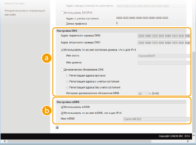 Установите флажок для динамического обновления записей DNS при каждом изменении IP-адреса аппарата. Чтобы задать типы адресов, которые необходимо зарегистрировать для DNS-сервера, установите этот флажок для [Регистрация адреса вручную], [Рег. адреса с учетом состояния] или [Рег. адреса без учета состояния]. Чтобы указать интервал между обновлениями, задайте значение времени в текстовом поле [Интервал динамического обновления DNS]. [Настройки mDNS][Использовать mDNS]