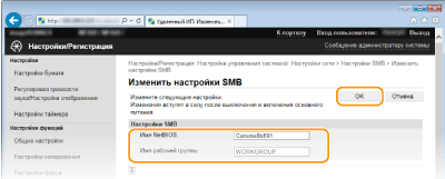 SMB (блок сообщений сервера) представляет собой протокол для общего доступа к ресурсам (например, файлам и принтерам) для нескольких устройств в сети. Аппарат использует SMB для сохранения сканированных документов в общую папку. В зависимости от особенностей сети, возможно, потребуется настроить имя NetBIOS и имя рабочей группы.