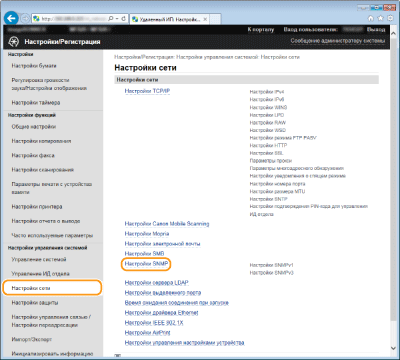 При установке на компьютере, подключенном к сети, программное обеспечение управления SNMP позволяет дистанционно настраивать, отслеживать и контролировать аппарат с компьютера. Дополнительные сведения о программном обеспечении управления см. в руководстве по эксплуатации для соответствующего сетевого устройства.