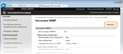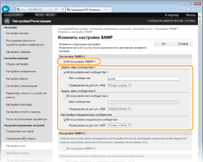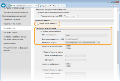 Если включены обе версии SNMP, рекомендуется задать для разрешений SNMPv1 на доступ к объектам MIB значение [Только чтение]. Разрешение на доступ к объектам MIB можно задать отдельно в SNMPv1 и SNMPv3 (а также для каждого из пользователей в SNMPv3). При выборе [Чтение/запись] (разрешение на полный доступ) в SNMPv1 снижает эффективность функций безопасности, которые отличают протокол SNMPv3, поскольку большинство параметров аппарата можно контролировать посредством SNMPv1.