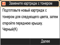 Цвет тонера, который следует заменить, отображается на экране. Если требуется заменить несколько картриджей с тонером, производите их замену в следующем порядке: черный, желтый, пурпурный, голубой.