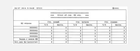 Если включена функция управления ИД отдела, для проверки общего числа распечаток для каждого <ИД отдела> можно напечатать отчет об управлении ИД отдела. Проверка общего числа распечаток позволяет оптимизировать управление закупками бумаги и тонера.