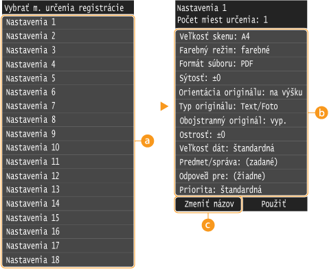 <Obľúbené nastavenia> <Upraviť/zmazať> <Odstrániť> poklepte na nastavenia, ktoré chcete upraviť <Áno>.Ak chcete použiť uložené nastavenie, poklepte na položky <Skenovať>