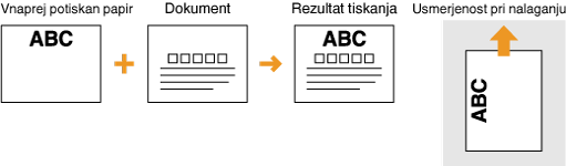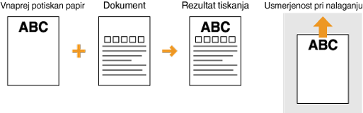 To poglavje v glavnem opisuje nalaganje potiskanega papirja v pravi smeri in postavitvi. Za opis splošnega postopka nalaganja papirja v kaseto za papir ali večnamenski pladenj, glejte Nalaganje papirja v kaseto ali Vstavljanje papirja v večnamenski pladenj.