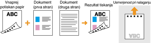 Nastavitev <Preklop načina dodaj. papirja>Če tiskate na potiskani papir, morate spremeniti postavitev naloženega papirja vsakič, ko želite tiskati enostransko ali dvostransko. Če pa je za <Preklop načina dodaj. papirja> izbrano <Prioriteta strani za tiskanje>, lahko pri enostranskem tiskanju uporabite isto postavitev kot pri dvostranskem tiskanju (stran z logotipom navzdol). Ta nastavitev je koristna predvsem, če pogosto uporabljate tako enostransko kot dvostransko tiskanje. Preklop načina dodaj. papirja
