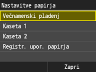 Ko registrirate privzeto nastavitev papirja, se pri nalaganju papirja ne prikaže zaslon za nastavitev papirja, saj se vedno uporabi ista nastavitev. Če naložite drugo velikost ali vrsto papirja in ne spremenite nastavitev papirja, naprava morda ne bo tiskala pravilno. Temu se izognete tako, da v 3. koraku izberete <Izključeno> in tako onemogočite privzeto nastavitev, nato pa naložite papir.