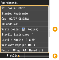 Prikažejo se število kopij, nastavitve in druge podrobnosti. Če želite samo preveriti podrobnosti, vendar ne želite preklicati kopiranja, pritisnite