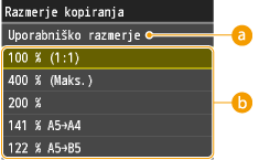 Kopije lahko povečate ali zmanjšate s prednastavljenim razmerjem kopiranja, kot je <A5->A4>, ali tako, da nastavite razmerje kopiranja v korakih po 1 %.
