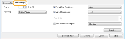 Kliknite zavihek [Print Settings] (Nastavitve tiskanja), da se odpre zaslon za določanje nastavitev, npr. števila kopij ali enostransko/dvostransko tiskanje. Tukaj določene nastavitve veljajo za celoten tiskalni postopek.