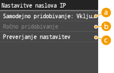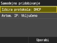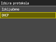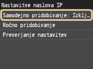 ![]() ![]() Če za dodeljevanje naslova IP ne želite uporabiti DHCP Izberite <Izključeno>. Če izberete <DHCP>, ko ta storitev ni na voljo, bo naprava porabila veliko časa in sredstev komunikacije za iskanje te storitve v omrežju. |