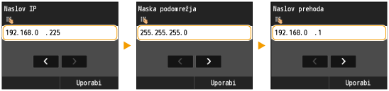 <Maska podomrežja> <Naslov prehoda>.Na vsakem zaslonu s številskimi tipkami vnesite nastavitev in tapnite <Uporabi>.