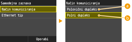 <Polovični dupleks> ali <Polni dupleks>.![]() <Polovični dupleks>Izmenično pošilja in sprejema komunikacijske podatke. Izberite, če je naprava povezana v omrežno napravo po sistemu polovičnega dupleksa.