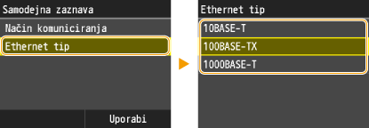 <10BASE-T>, <100BASE-TX> ali <1000BASE-T>.![]() ![]() Če želite določiti <1000BASE-T>, morate v 2. koraku izbrati <Polni dupleks>.