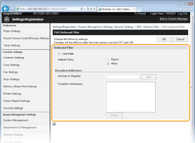 ![]() Preverite, ali ste se pri vnašanju zmotili Če naslovov MAC ne vnesete pravilno, morda do naprave ne boste mogli dostopati iz vmesnika Remote UI (Oddaljeni uporabniški vmesnik). V tem primeru morate <MAC Address Filter> nastaviti na <Izključeno>. Filter naslova MAC