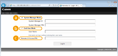 V vmesniku Remote UI (Oddaljeni uporabniški vmesnik) lahko izvajate vse operacije in nastavitve. V [ID skrbnika sistema] vnesite ustrezen ID, v [Koda PIN sistemskega skrbnika] pa ustrezen PIN (