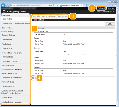 Odpre stran [Settings/Registration]. Če ste prijavljeni v načinu upravitelja sistema, lahko spremenite nastavitve in registrirane podatke shranite/naložite.