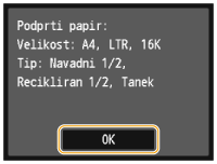 Preverite, ali je v napravi naložena velikost in vrsta papirja, ki je prikazan na zaslonu, in tapnite <OK>.