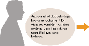 Gå till <Favoritinställningar> och registrera kombinationen <2-sidig> och <Sortera> inställd på <På>. Du kan sedan använda den här inställningskombinationen när du vill. Registrera vanliga kopieringsinställningar