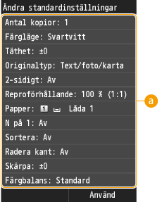 <Meny>  <Kopieringsinställningar>  <Ändra standardinställningar>  Tryck på inställningen  Ändra standardvärdet för valt alternativ <Använd>