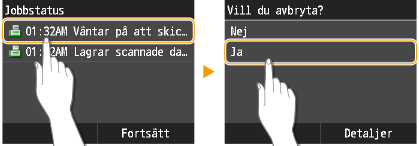 Dokument har skannats och väntar på att utföras. Tryck på det dokument som ska avbrytas.