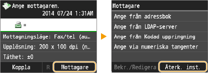 Du kan välja en mottagare bland de tre senaste mottagarna. Om du anger en tidigare använd mottagare ställs samma faxinställningar in som du använde senaste gången du skickade dokument till samma mottagare.