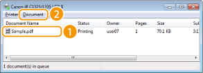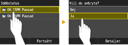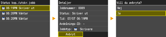 Avbryta med FjärranvändargränssnittetDu kan avbryta utskriften från sidan [Jobbstatus] i Fjärranvändargränssnittet: Kontrollera aktuell status för utskriftsdokument