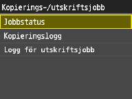 ![]() <Logg för utskriftsjobb>Visar en lista med de dokument som skrivits ut. <OK> visas när ett dokument skrivits ut och <Fel> visas när ett dokument inte kunde skrivas ut på grund av att det annullerats eller att ett fel inträffat.