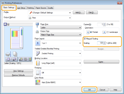 Fliken [Grundinställningar] Markera kryssrutan [Skala manuellt] Ange utskriftsförhållandet i [Skala] [OK]