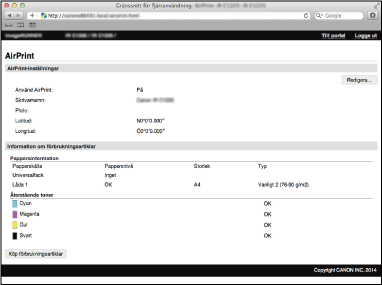 Du kan visa skärmen för AirPrint, där du inte bara kan visa AirPrint-inställningar utan också visa information om förbrukningsartiklar, till exempel papper och toner.