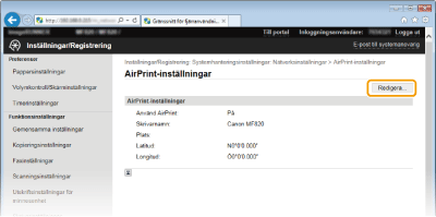 Du kan registrera information, däribland namn på enheten och installationsplats, som används för identifiering av enheten. Du kan även inaktivera AirPrint-funktionen för enheten. Använd Fjärranvändargränssnittet för att ändra dessa inställningar.