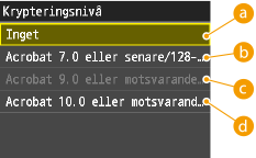 Om du vill ange om <Acrobat 9.0 eller motsvarande/256-bitars AES> och <Acrobat 10.0 eller motsvarande/256-bitars AES> kan väljas läser du 256-bitars AES-inställningar för krypterad PDF.