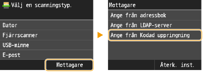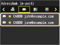 Med adressboken kan du ange en mottagare genom att välja i en lista med registrerade mottagare eller genom att söka efter namn på mottagare. Du kan också direkt ange en mottagare genom att ange det tresiffriga tal (kortnummer) som tilldelats en mottagare.