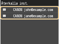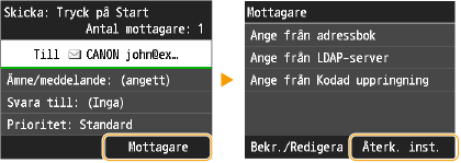 Du kan välja en mottagare bland de tre senaste mottagarna. Om du anger en tidigare använd mottagare ställs samma skanningsinställningar in som du använde senaste gången du skickade dokument till samma mottagare.