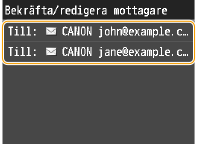 Innan du trycker på <Bekr./Redigera> i steg 1 kan du trycka på  /  för att växla mellan mottagare du angett. Visa den mottagare som du vill ta bort och tryck på  .